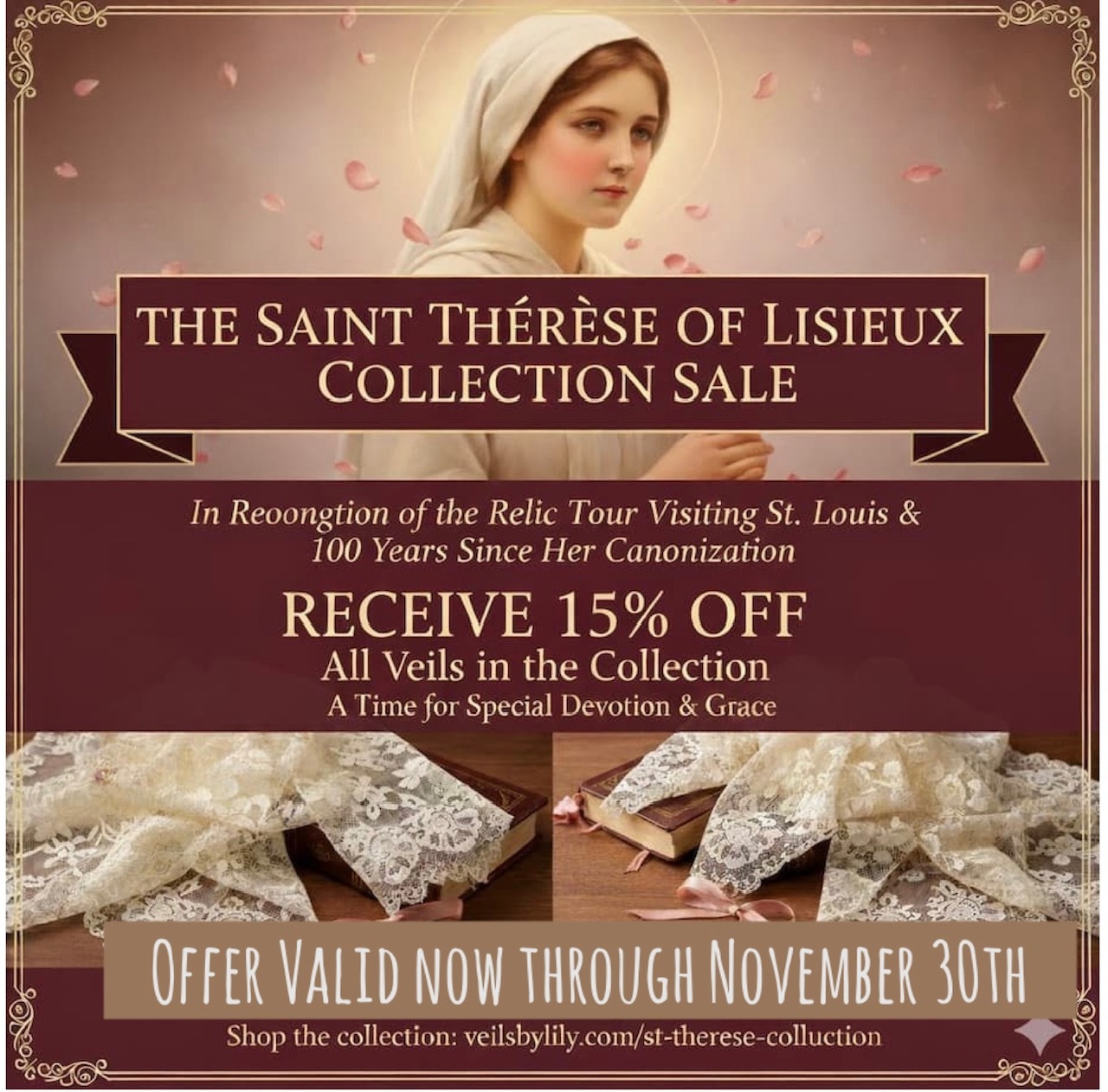 In honor of her legacy, we are offering a LIMITED TIME 15% off discount for our Therese Collection and the Rose. This discount for RETAIL orders will automatically apply to the following veils: